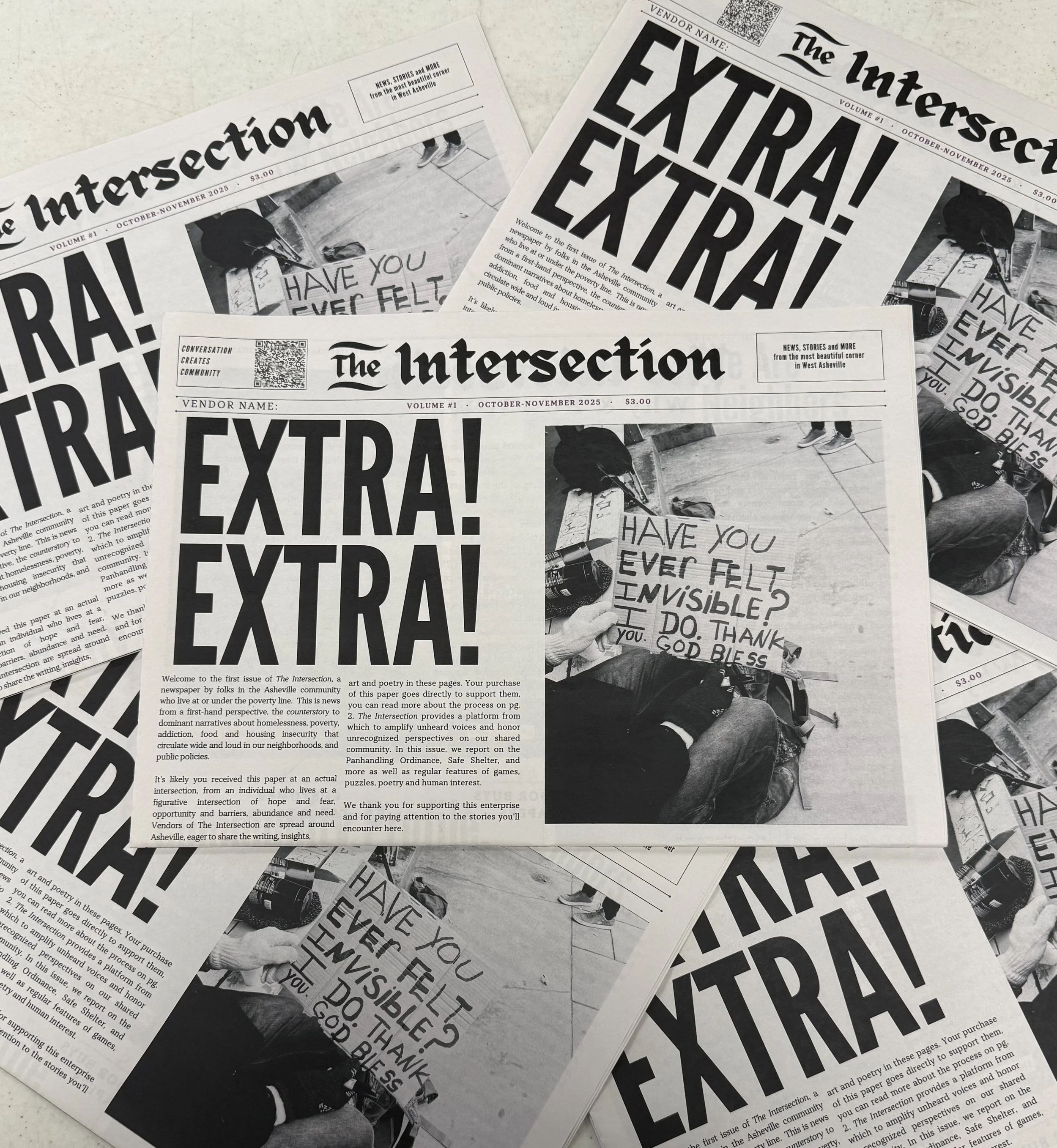 The Intersection is a physical print newspaper founded, published and supported by the community of Asheville Poverty Initiative. It can be exclusively found from vendors in the streets of Downtown and West Asheville. To locate vendors, keep up with our social media for weekly updates, or simply look out for them when you’re out and about!